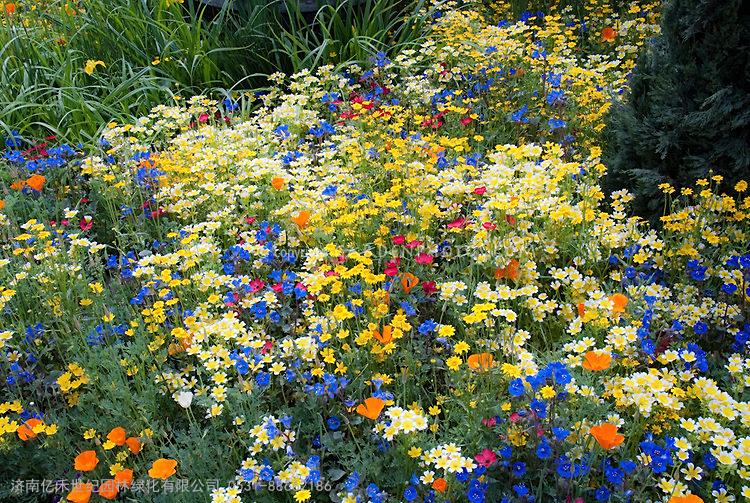 (2)野花组合通常是由一、二年生草花和多年生花卉按配方组合而成。混配一年生花卉的目的是保证种植当年就能见效果,同时一年生花卉发芽生长较快,能迅速覆盖地面,不但有利于控制杂草蔓延,还有利于多年生(包括二年生)花卉的萌发生长。但是,如果一年生草花没有自播繁衍能力或者种植地的生态条件不利于种子自播繁衍,要保持理想的景观效果,就必须每年进行补播。当然,补播种子用量一定要适宜,千万不能过量播种。