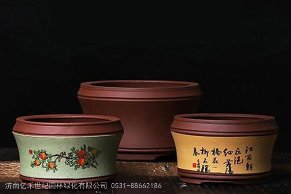 签筒形适于栽植金银花、紫藤、吊兰及悬崖式桩景等藤蔓、悬垂性花卉,颇富诗情花意;盆口大且高度适中的紫砂盆,适于种植米兰、石榴、杜鹃、三角梅、菊花等;特大型花盆则适于棕榈、广玉兰、白兰、桂花、铁树、柑橘类及荷花等水生花卉;浅盆适于雀梅、赤楠、枫、榆、南天竹、五针松等盆景树种,突出曲拙古奇的虬根、劲古的枝干,使桩景高雅而秀逸。微型掌盆小巧精美,适于六月雪、虎耳草、金钱草、蕨类、迎春、美人蕉、黄杨等,更由于能工巧匠精心制作,以刀代笔,盆外壁面刻以山水花鸟图案或铭上词诗书法,令人生发古朴幽情,其精巧细腻之工,具有颇高的工艺水平,博得海内外花卉爱好者的青睐。