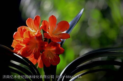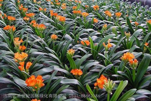 君子兰 叶片浓绿色,较宽厚,呈长带形,花大而直立,通常十数朵着生在伞形花序上,形成一大花团,橙红色,十分鲜艳,正值春节前后开花,深受人们喜爱。