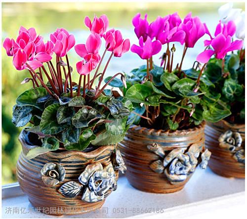 养护提示:仙客来既不耐严寒也不耐高温,生长适温在10~20℃,30℃以上会进入休眠期,5℃以下生长缓慢。夜间温度高则难以开花,千万不要将花盆放在暖气片上。喜明亮的光线,但忌强光直射。常保持盆土湿润,可以采用盆底浸水的办法灌水,并常向植物周围喷水。仙客来喜水又忌湿,要严加防止积水或渍涝,否则根系一旦腐烂,全株就会很快死亡。