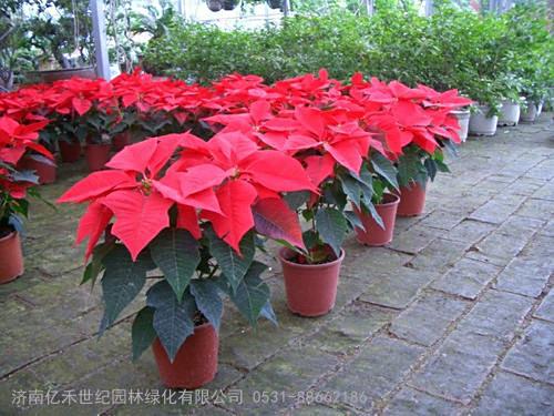 一品红 又称圣诞红,苞叶红色,正常花期在12月中下旬,正值圣诞期间,深受消费者的喜欢。